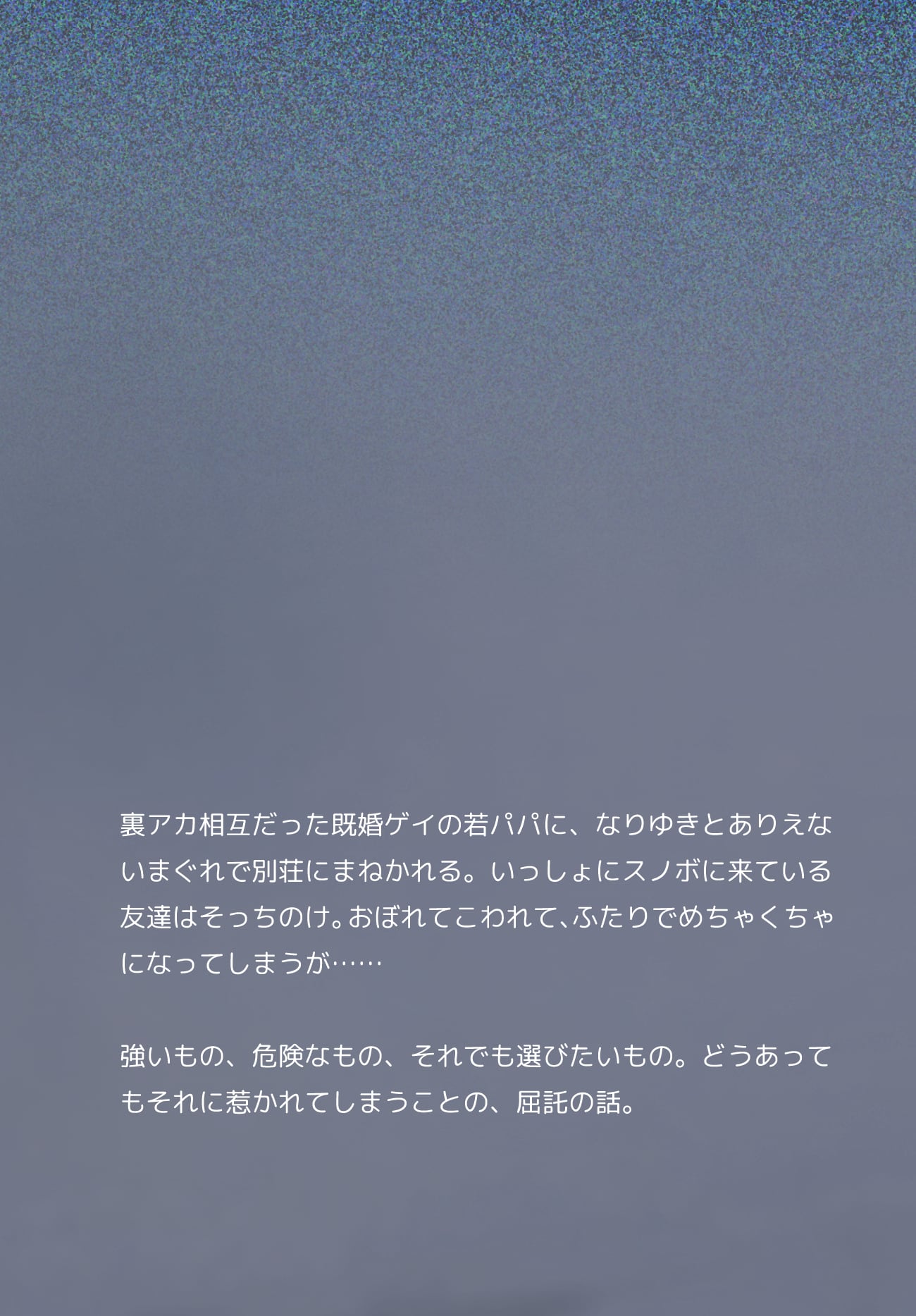 裏アカ相互だった既婚ゲイの若パパに、なりゆきとありえないまぐれで別荘に招かれる。いっしょにスノボにきた友達はそっちのけ。おぼれてこわれて、ふたりでめちゃくちゃになってしまうが……